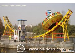 The flying UFO, which is also know as flying disc, it is newly developed by our company. There are 24 seats on the big turntable. When the turntable spins and glide along the curved track, there are colorful led lights and cheerful and exciting music. It is a kind of new roller coaster which are well enjoyed by young and adults.